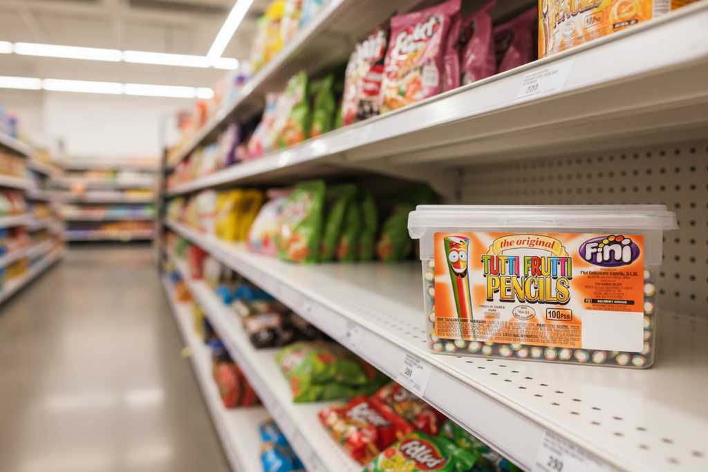 Sugar, glucose and fructose syrup, wheat flour (gluten), starch, gelatine, vegetable fat (palm, coconut), vegetable oil (palm, coconut), acids (E270, E296, E330), flavourings, acidity regulators (E325, E331), salt, emulsifier (E471), humectant (E422), colours ( E102, E110, E129, E133, E171).