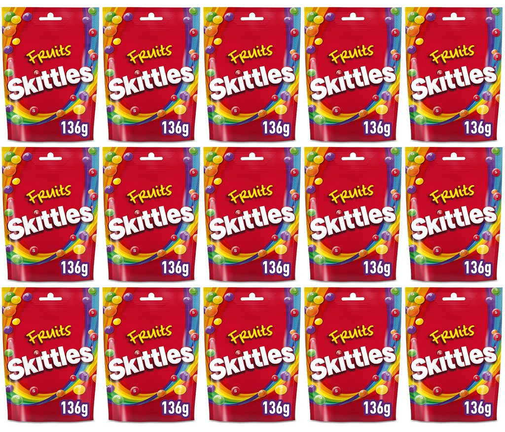 15 x Skittles Vegan Chewy Sweets Fruit Flavoured Pouch Bag 136G