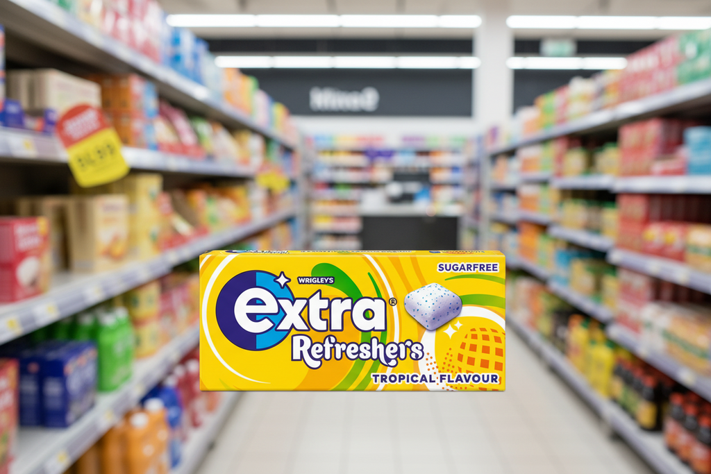 Sweeteners (Xylitol, Sorbitol, Mannitol, Aspartame, Acesulfame K), Gum Base, Humectant (Glycerol), Flavourings, Thickener (Gum Arabic), Acids (Malic Acid, Citric Acid), Emulsifier (Soya Lecithin), Glazing Agent (Carnauba Wax), Antioxidant (BHA), Colour (E133).