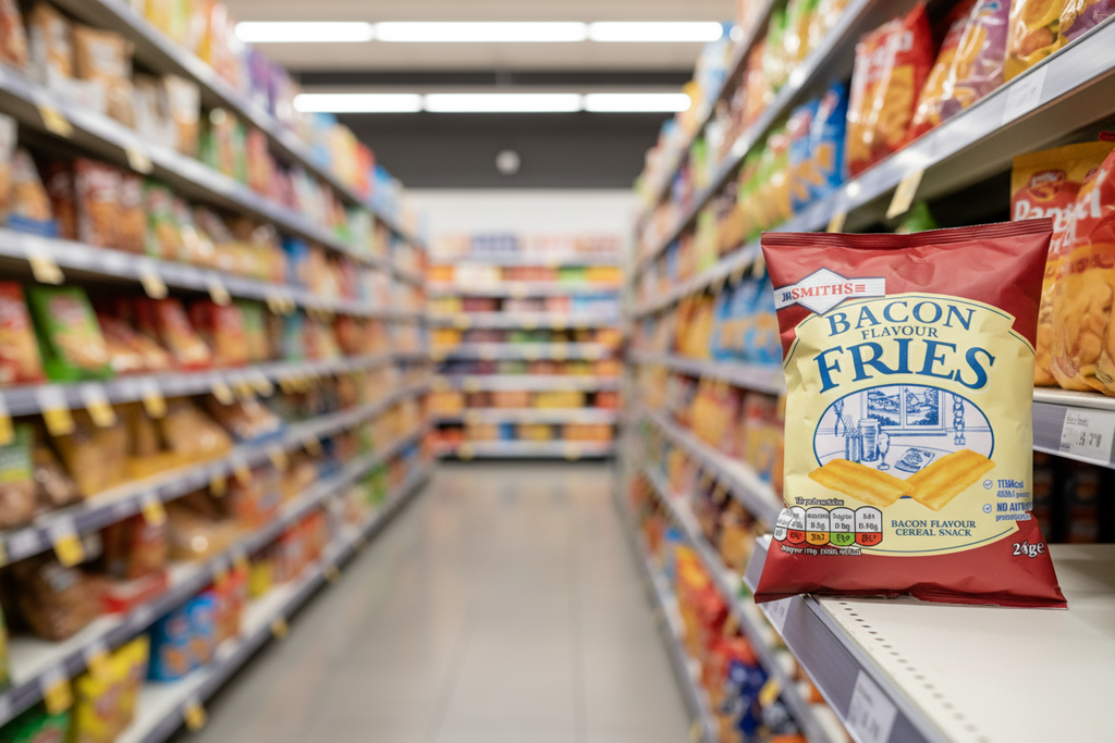 Vegetable Oils (Sunflower, Rapeseed, in varying proportions), Maize, Soya Grits, Rice, Bacon Flavour Seasoning [Whey Powder (from Milk), Breadcrumbs (contains Wheat), Salt, Flavourings, Sugar, Flavour Enhancer (Monosodium Glutamate), Potassium Chloride, Smoke Flavouring], Hydrolysed Soya Protein, Yeast Powder, Wheatflour (contains Calcium, Iron, Niacin, Thiamin), Colour (Sulphite Ammonia Caramel).
